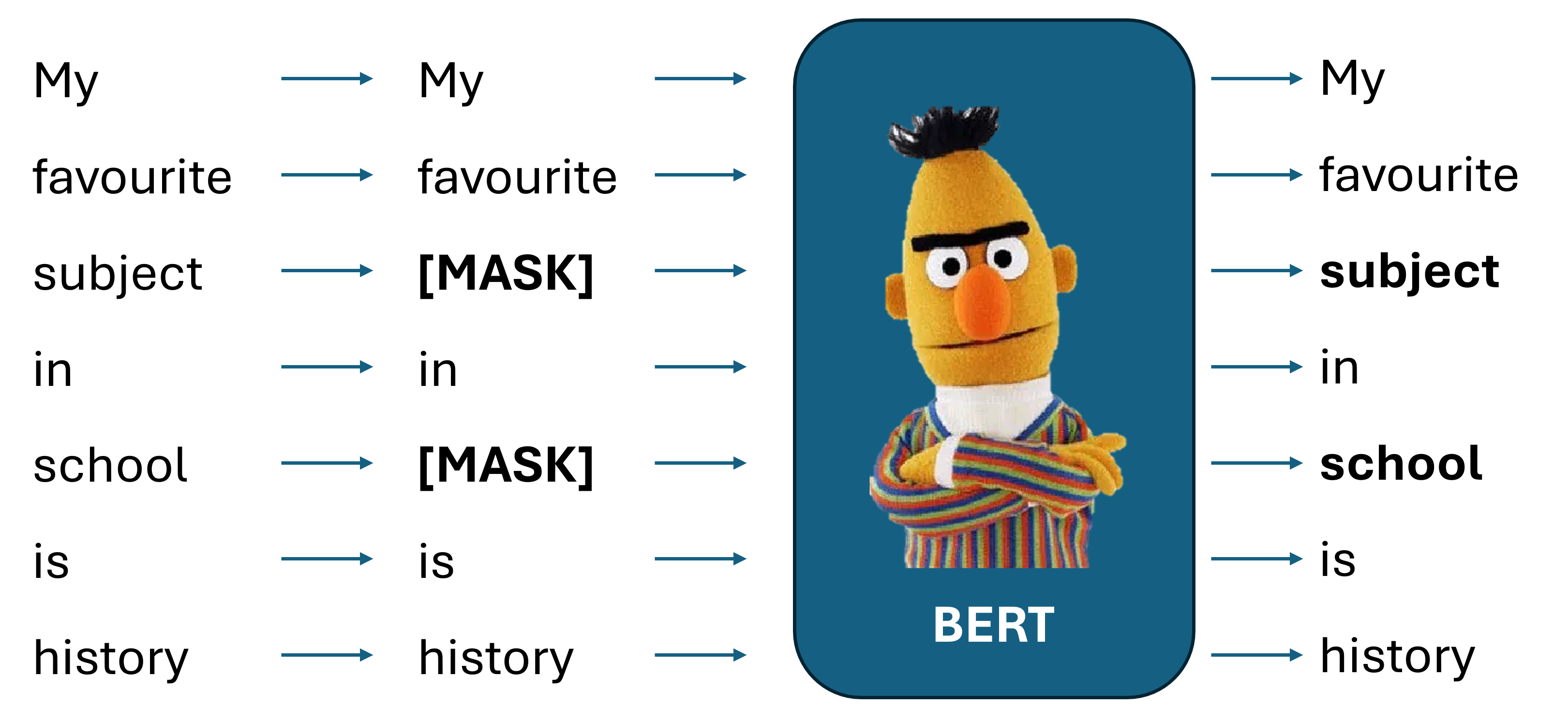- 10% are left unchanged (ensuring the model still values the actual word when it is present).